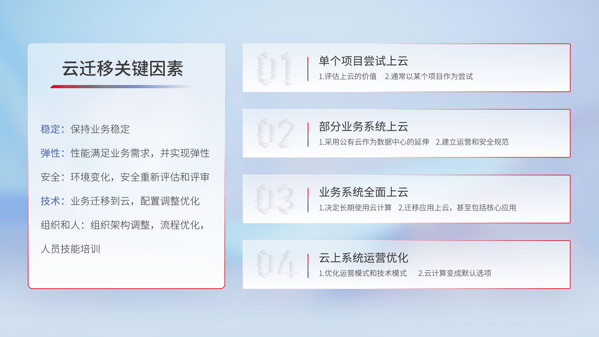 结合实际业务,,从规划设计、、、云平台选型、、、、云原生改造、、、、数据迁移、、、集成交付,,,迁移全过程为客户识别最佳上云路径,,,做好风险识别管理,,,设计网络架构、、、、身份权限、、、安全审计合规、、、操作审计、、、、日志审计、、、、监控告警策略、、多站点容灾设计等,,,,对云上基础设施进行整体规划,,,,提升IT治理水平,,,,以满足弹性、、、高可用、、、高性能的需求。。。。