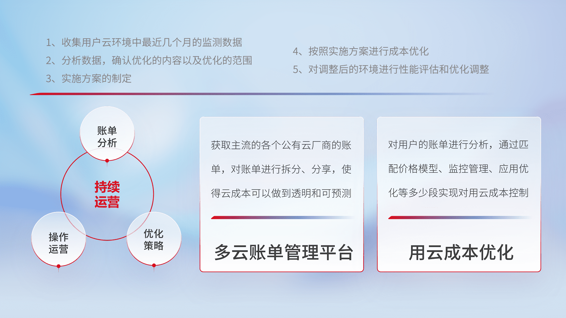 通过多云纳管,,,,以统一的资源数据模型把客户的云资源进行抽象和封装,,,进而实现对多云资源的统一操作,,,保障云资源管理的可靠性、、、、稳定性与可用性。。。。量身定制化运维内容,,配置、、开发运维、、、、补丁管理、、、、备份、、监控、、、、认证和访问管理、、、审计和日常巡检等,,保障在用云过程中的可靠度,,,,稳定度以及高可用率。。。